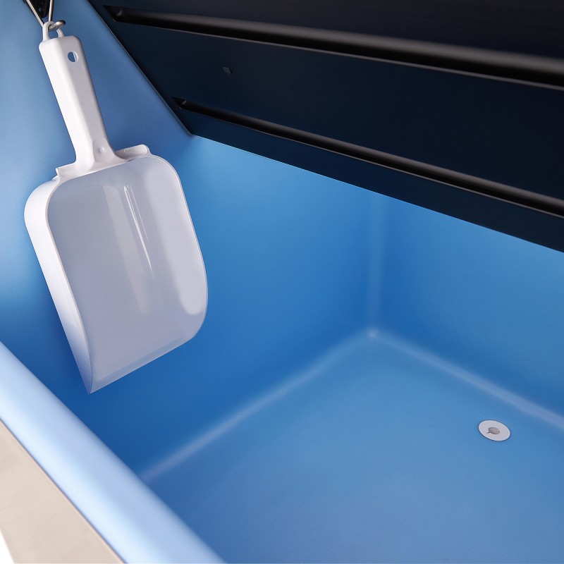 Depósito de hielo de diseño ergonómico y fácil instalación, con capacidad de almacenaje de 388 Kg con revestimiento de polietileno y espuma para conservar el hielo por más tiempo.