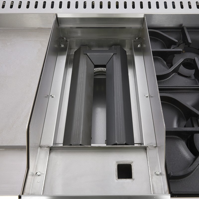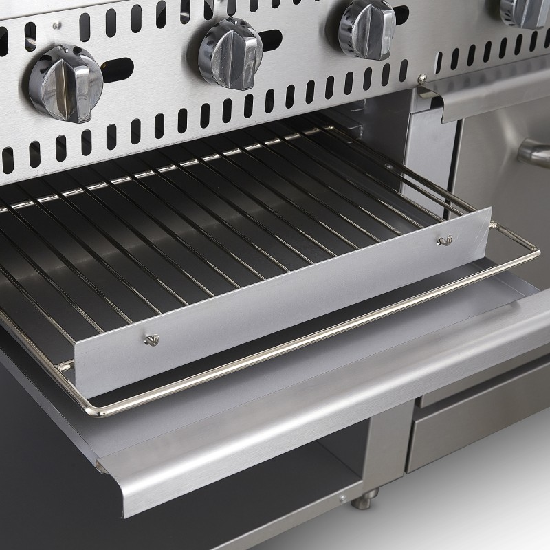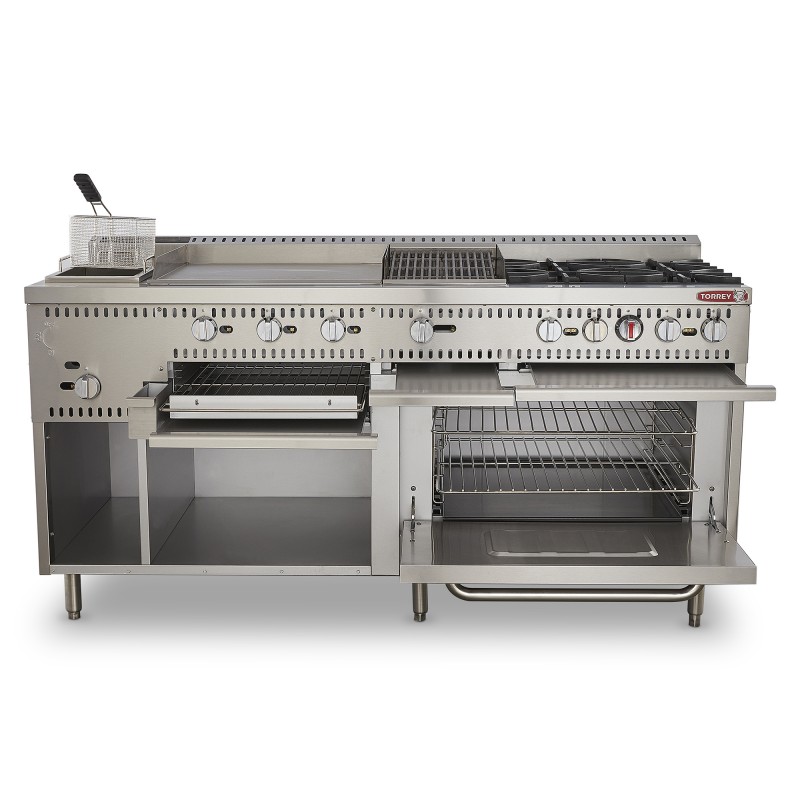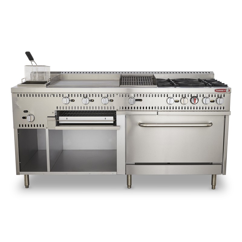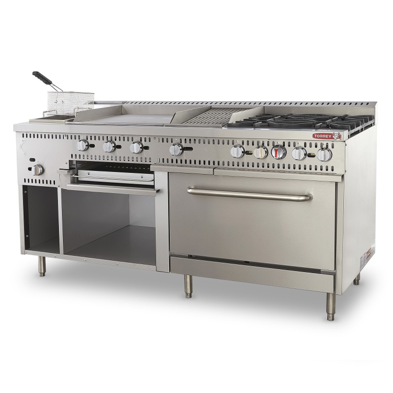Estufa profesional de gas con parrillas, horno, freidora, plancha, asador y gratinador para solucionar todas tus necesidades de cocción en un sólo equipo integrado.