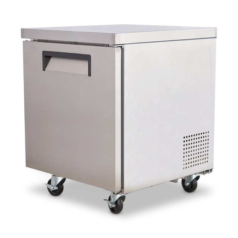 Mesa fría bajo barra de 27 pulgadas, construida en acero inoxidable para mayor durabilidad e higiene. Puede ser utilizado como mesa o isla de trabajo en cocinas, o como un refrigerador bajo barra.