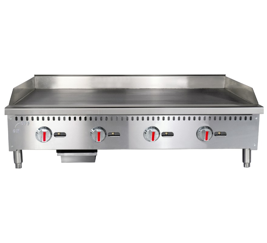 - Plancha a gas 4 quemadores, fabricada en acero inoxidable tipo 430, 4 perillas ergonómicas fabricadas en polímeros de alta resistencia, 4 quemadores tipo "U" y charola para recolectar residuos por debajo de sus quemadores.