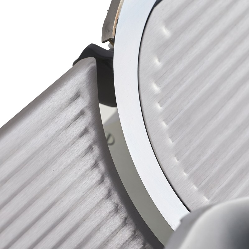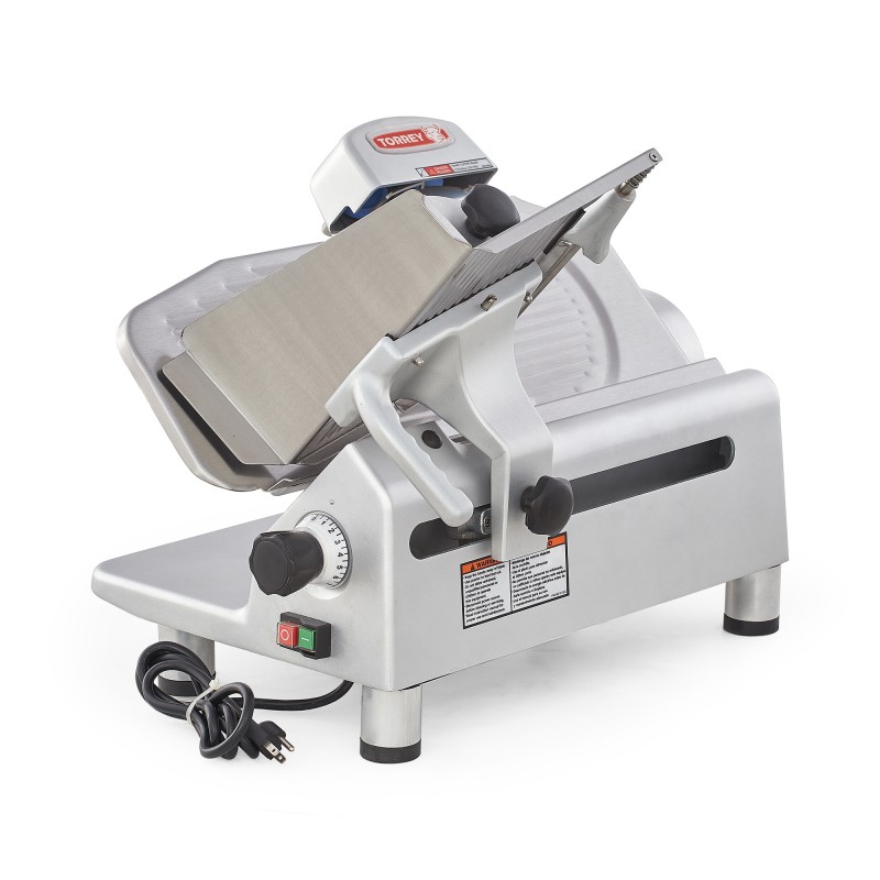 Rebanadora con transmisión de engranes, ideal para cortar carnes rojas sin hueso, construida en die casting y acero inoxidable con cuchilla de 300 mm.