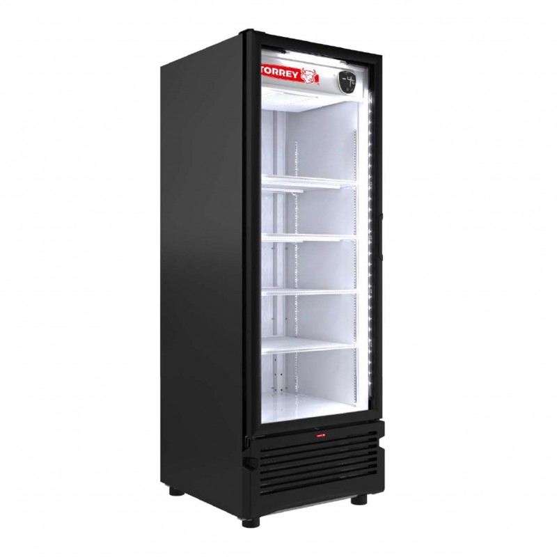 Refrigerador vertical de exhibición de 25 pies, con sistema de enfriamiento por aire forzado, 4 parrillas ajustables e iluminación LED.