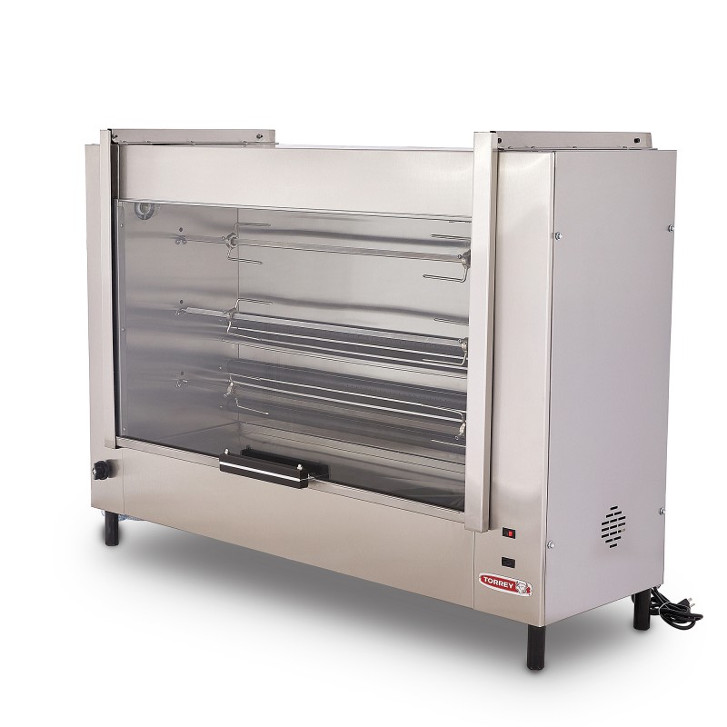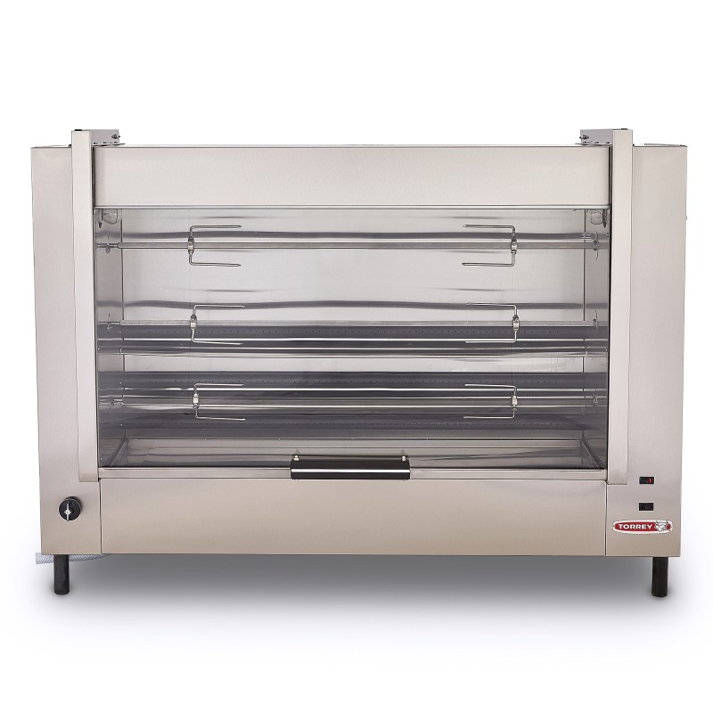 Rosticero de gas fabricado en acero inoxidable con capacidad para 27 pollos, espacio para exhibición caliente.