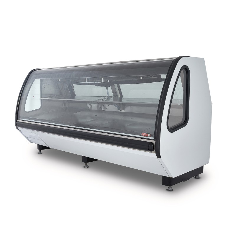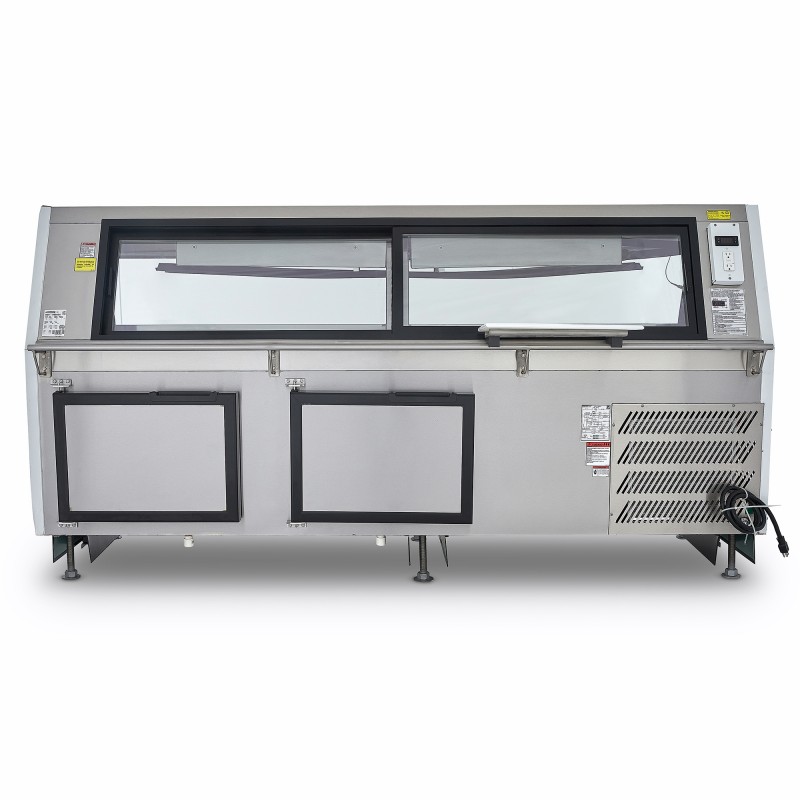 Vitrina carnicera autocontenida de color blanco de 2.5 m de largo, puertas posteriores de vidrio, congelador inferior ideal para establecimientos grandes de venta de carne.