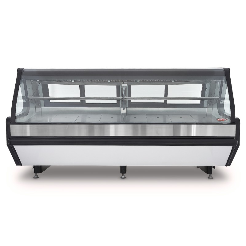 Vitrina carnicera modular blanca de 2.5 m de largo, con pisos y charolas de exhibición en acero inoxidable, ventanas laterales y puertas posteriores de vidrio para exhibición panorámica, cuenta con almacén inferior para congelamiento, ideal para grandes cadenas de autoservicios y carnicerías grandes.
