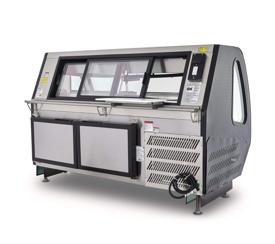 Vitrina carnicera auto contenida de color negro de 2 m de largo, puertas posteriores de vidrio, congelador inferior ideal para establecimientos grandes de venta de carne.