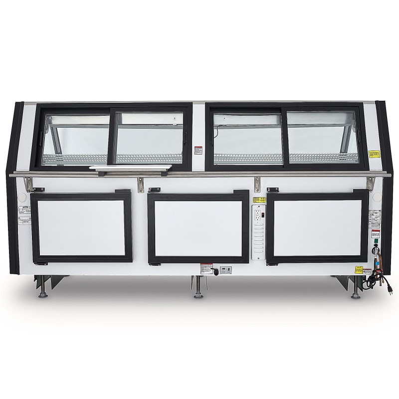 Vitrina carnicera modular de 2.5 m de largo color blanco, con vidrio frontal abatible que facilita el llenado de producto y limpieza, con ventanas laterales y puertas posteriores de vidrio para exhibición panorámica, y almacén inferior para congelamiento, ideal para grandes cadenas de autoservicios y carnicerías grandes.